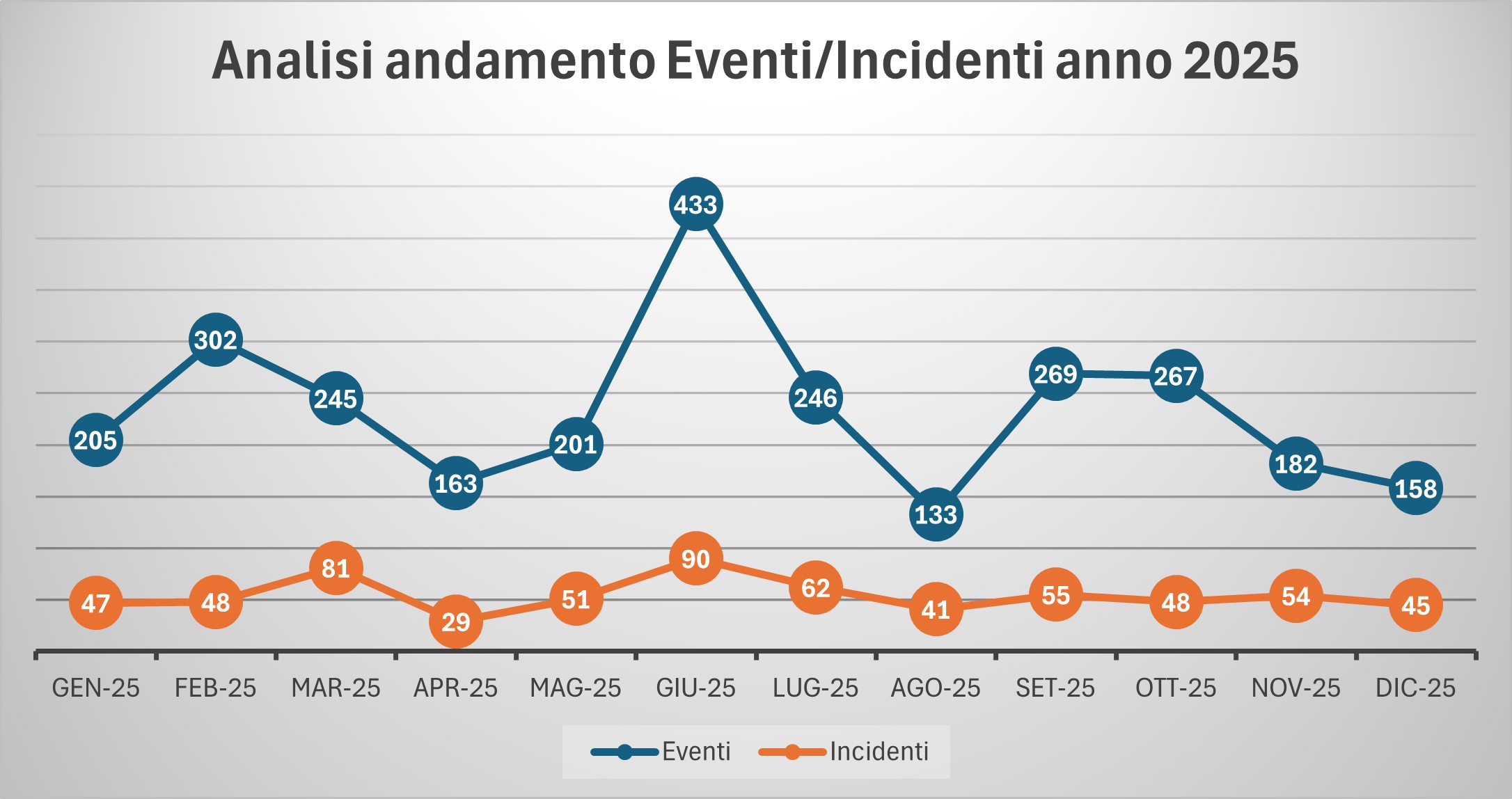Se osserviamo i dati, vediamo come il cosiddetto "tasso di incidentalizzazione", ovvero il numero di eventi che si trasformano in incidenti nel 2025 è pari al 23%, ovvero meno di un quarto degli eventi si trasforma in un incidente confermato. Tuttavia, il dato analitico per singolo mese e semestre, evidenzia una tendenza peggiorativa. Infatti, se nel primo semestre tale percentuale era di circa il 22%, nel secondo semestre questa percentuale sale a poco più del 24%.